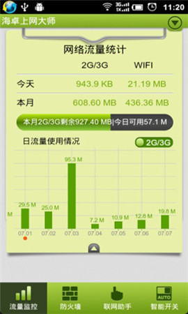 2.现阶段最领跑的网络防火墙,集全部信息内容于一页面,对流量状况和实际操作游刃有余:分应用统计学流量,分WIFI和2G/3G统计分析流量,显示信息已经运作(翠绿色运用名字)和已经联网(安全上网标记)的运用!方便快捷的程序流程流量搜索,可按关键词搜索,按WIFI或2G/3G流量大孝按选中、按联网情况、按运作情况排列等。
