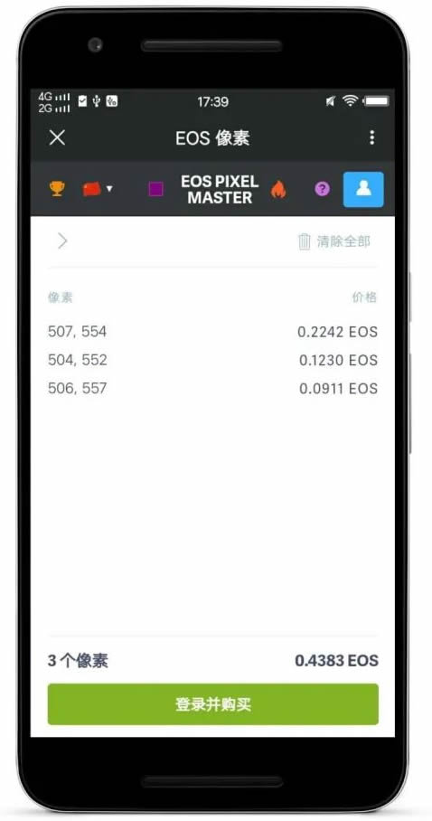 1. 以EOS PIXEL MASTER为例,在DApp Store进入该应用,选好要画的像素后,点右侧的“购物车”进行结算。