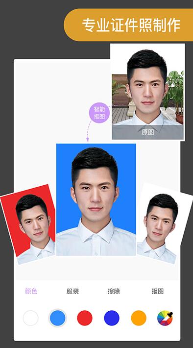 证件照相机+多种证件照尺寸+自动抠图+修改底色+精美的男女正装+美颜