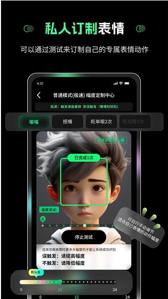 个性化表情动作,提供表情变化幅度测试功能,让您能够定制专属的面部表情动作,从而实现更加精准智能的手机操作方式。