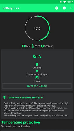 batteryguru是一款能让用户手机时刻保持在最佳运行状态的软件,它能很好的降低电池老化和磨损,不用任何的手动配置,智能的定制手机用电习惯,为手机提供了各种的贴心防护提醒。它能通过各种不一样的使用模式,在正常的操作情况下也能有效的使用,还有很多的日常防护能着你来使用。