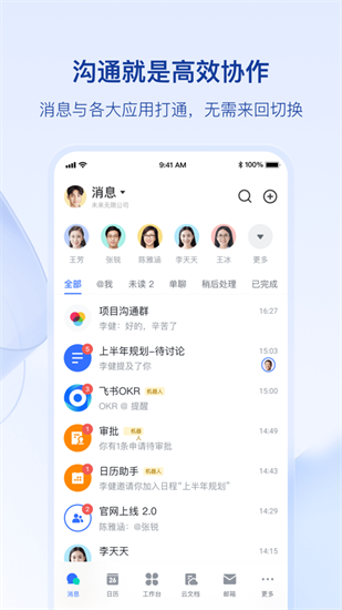 飞书是一款手机移动办公软件,是专门为企业设计的高效沟通和协作办公的。它具有高效沟通、协作文档、共享日历、音视频会议、云文档、云盘等功能于一体,为用户提供一站式的文档解决方案。支持数百人同人同时进入视频会议,方便快捷,可以放心的执行各种远程工作。