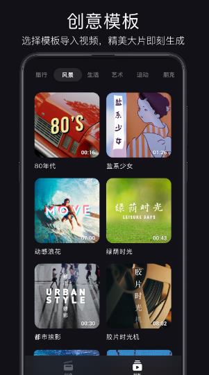 1、内置多款创意模板视频,涵盖旅行、生活、运动、城市风光、艺术等不同风格视频模板。