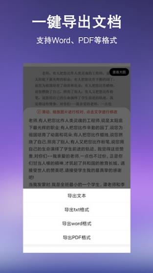 1、文档编辑导出:批量识别后的文字可进行自由编辑、复制、翻译、校对、重新识别,编辑起来非常省心!支持一键分享导出,多种格式任你选.