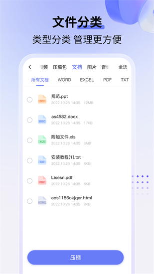 蓝山压缩是一款专门针对手机解压所打造的软件,它能一键全盘扫描所有的数据文件,还支持很多种文件的类型和轻松进行解压处理。它的操作简单,功能强大,可以帮助用户解决不少问题。利用该软件去管理文件,非常的方便。支持用户在线一键分享,互相探讨使用的体验,有需要的就来下载试试吧。