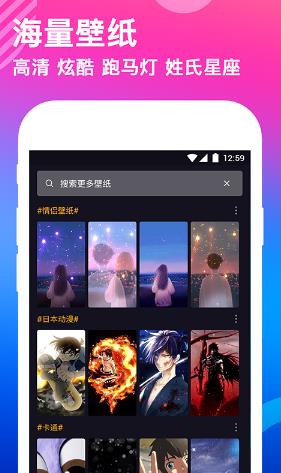 2.壁纸、分屏壁纸、美学治愈风景壁纸、个性化文字壁纸、专属姓氏壁纸、卡通动漫壁纸、游戏动态壁纸、影视人物壁纸、液体壁纸等。