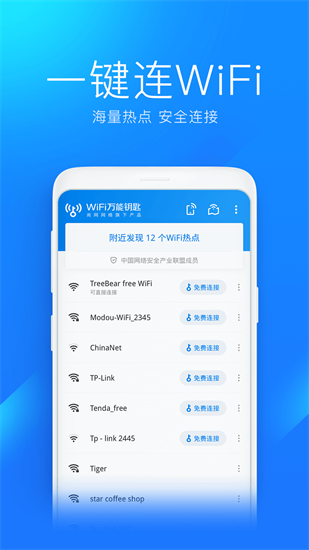 WiFi万能钥匙是一款功能很强大、实用的免费连接WiFi软件,它为用户提供了安全稳定的互联网接入服务。它可以随时提供用户有效的WiFi上网服务,只要有WiFi信号,就能一键连接,免费上网。不管你身处哪里,只要打开该软件就能看到共享热点,它还支持热点共享功能,用户可以通过手机或平板上的网络与他人共享。