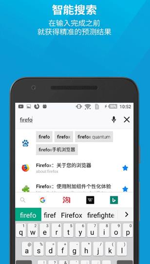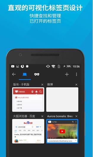 火狐浏览器是一款专为移动端所打造的极致浏览器,该软件的速度很快,不管是从启动到页面加载,还是页面平移和缩放都可以带给用户很快的浏览体验。同时还支持多项个性设置,不仅可以完全保护隐私安全,还能带来快速、智能、安全的移动互联网优质体验。