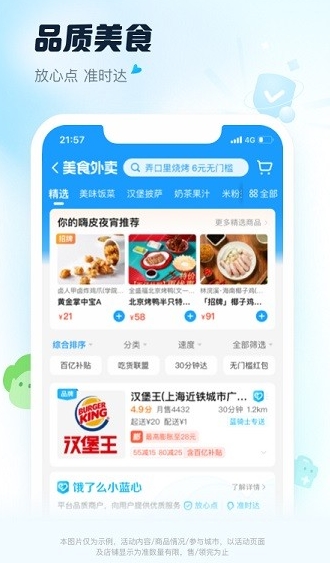 饿了么app下载现已覆盖国内的2000多个城市,加盟的餐厅有1,300,000家以上,还有50000+高端品牌连锁餐厅如必胜客、麦当劳、肯德基、汉堡王、海底捞等。网罗周边各类外卖,中餐、西餐、快餐、简餐、下午茶、夜宵、甜点、甜品、水果、火锅、烧烤、烘焙、生鲜、蛋糕、寿司、咖啡、汉堡、早餐、鲜花、果蔬、超市购物……各类特价优惠套餐、满减折扣优惠、立减优惠套餐,一手掌握美好生活!