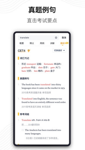 5、个性化定制:根据学习目标,可设置“职场商务、托福雅思、考研、四六级、初高中”等词典偏好,获取特专属词汇书和精讲。