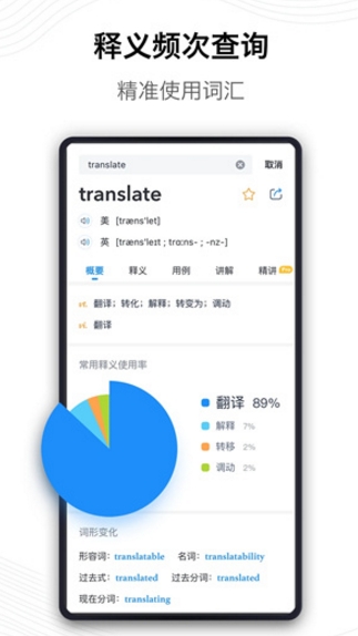 7、单词使用频率视觉化:释义饼图展示并按百分比降序排列,精准使用每个单词。