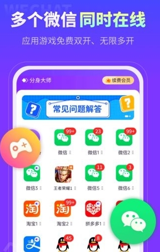 众多微信用户信赖的分身类APP,免费支持微信分身、微信双开、QQ分身、派派分身,淘宝分身、支付宝分身、快手分身、拼多多分身、TT语音分身、游戏分身等所有应用的双开分身,工作生活两不误。