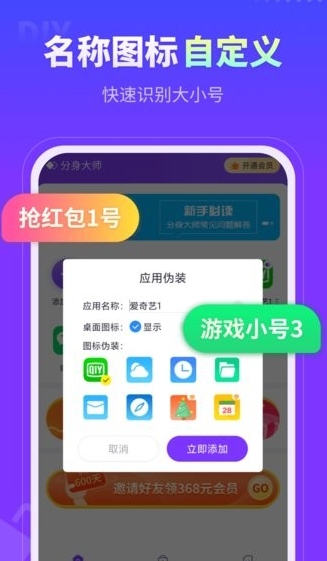 分身大师支持双开、分身或多开的应用(如微信分身、微信多开、微信双开)自由编辑图标、名称、添加到桌面等,一切随心定制。