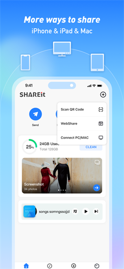 shareit是一款很实用的文件传输软件,它有着强大的数据快速文件传输功能,在不远的距离内,两台设备可以快速连接传输,隐私保护性好,传输速度特快,就算是在信号差的地方也能完成文件的传输。该软件可以快速传输各种文件格式,也推出了多种短视频社交功能,这样就可以观看短视频,领流量自由传输了。