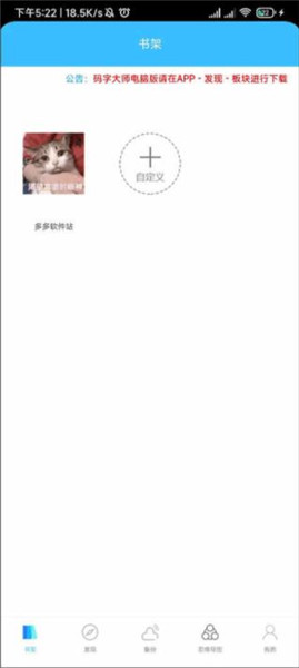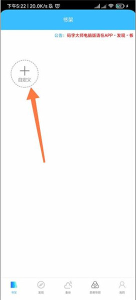 1、打开码字大师app,在书架界面点击箭头所指的自定义加号图标。