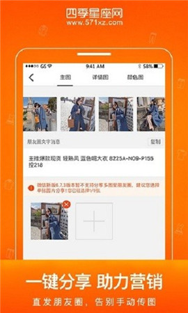 致力于将电子商务与实体市场完美结合,成功开拓了一件代发、零库存备货等交易模式,实现了零秒上新、知识产权保护、一键上传等便捷服务,是新兴的S2B市场模式的践行者,是国内较早以线下资源整合辅助经销商完成用户需求的平台之一。星座进货宝是为网店卖家提供一键找服装服饰类货源的工具,在APP上可以将看到的衣服或者商品图片保存到手机本地,然后用软件上的图片找货源功能在星座进货宝上找到同款或者相似款的批发货源。