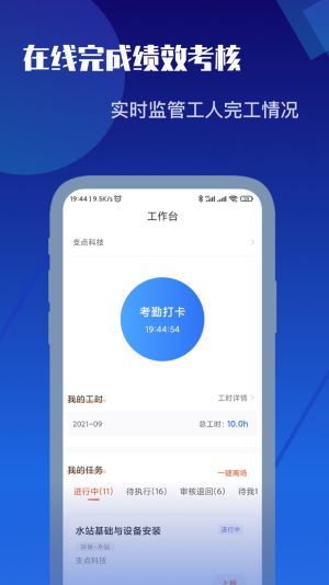 2、在软件的工作台中,用户可以使用智能打卡和考勤功能。用户还可以查看他们的工作时间、每日任务和其他详细的工作细节。