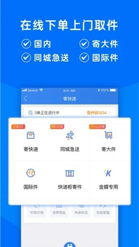 2、一键添加您的专属快递员、免手写电子面单、在线支付运费等,更多寄件功能等你来体验。