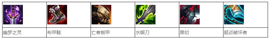 幽梦之灵+布甲鞋+亡者板甲+水银刀+黑切+挺近破坏者,这套出装既增加了英雄的攻击力,也增加了英雄的生命值,还提高了英雄的攻击速度。
