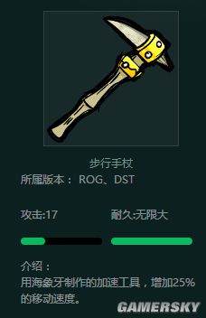 理由:饥荒神器!!!手杖是长途旅行,跋山涉水的神器,赶路,打怪都需要他的支持。他也是饥友每天使用时间最长的道具,哈哈。
