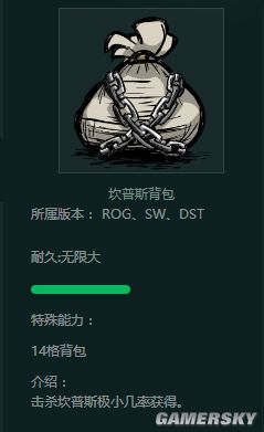 理由:坎普斯背包拥有十四格背包中最大储存量,防火防水放雷劈,相当于移动小金库。不过超低的爆率成为每一个玩家心中的痛。包括我……玩了这么久背过几次才……
