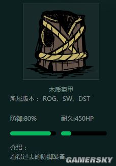 理由:最廉价的成本制造的高使用比防御道具,估计每天饥荒水友穿的最多的就是这个东西,我也一样,虽然我很喜欢铥矿甲,但是不实用,量产起来需要很久时间,而木甲才是支撑我挑战饥荒大陆的强力后盾。