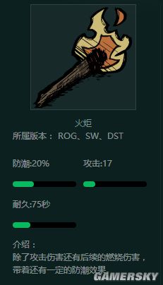 理由:对于火把来说。我只想说一个善用火把的老司机才是合格的老司机,火把的用途很大,开局,打怪,支撑寒冷的永冬这都是它价值的体现,没别的赞美之词,冬春我都会带着,当然是以材料的形式。