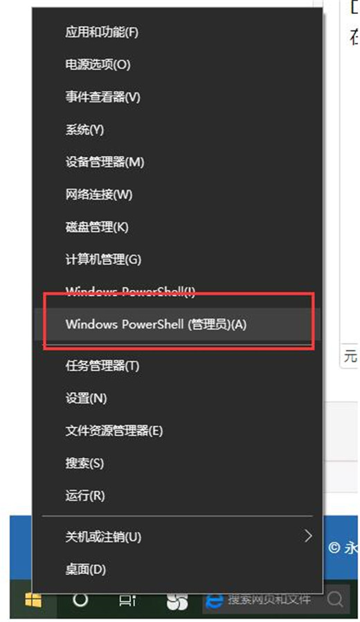6、然后右击开始菜单,点击Windows powershell(管理员)