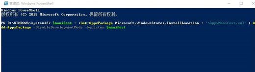$manifest = (Get-AppxPackage Microsoft.WindowsStore).InstallLocation + ‘AppxManifest.xml’ ; Add-AppxPackage -DisableDevelopmentMode -Register $manifest