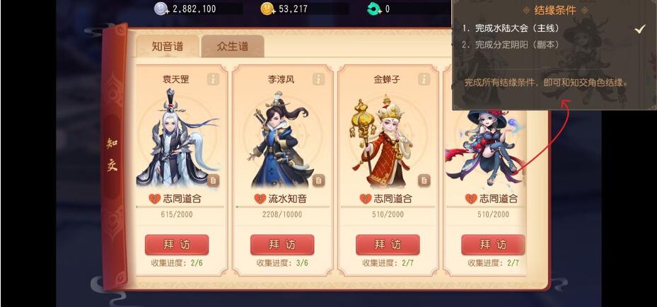 完成相关主线任务就可以结缘,点击NPC会显示你和他的好感度以及每日好感度任务完成情况。好感度襄助任务可以在指定时间接取,完成2次,每天完成2次。