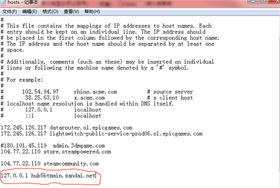 3.最后在文件中添加127.0.0.1 hub5btmain.sandai.net,如下图