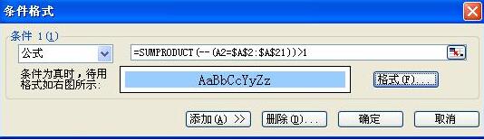 =IF(SUMPRODUCT(--(A2=$A$2:$A$21))》1,“重复”,“”)
