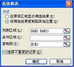 2.在“高级筛选”对话框中,选择“将筛选结果复制到其他位置”,并且勾选“选择不重复的记录”,单击“列表区域”文本框右侧的按钮,选择区域A2:A21,表示需要筛选的数据区为A2:A21,同样,将“复制到”区域设置为$C$2,如图。