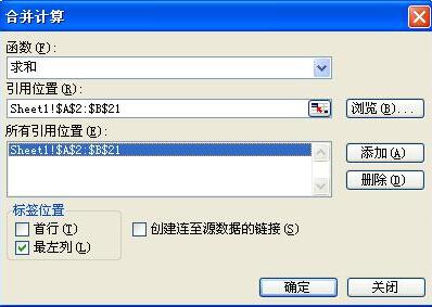 2.本例将删除重复值的数据将放置在D列,选择D2单元格。单击菜单“数据→合并计算”,弹出“合并计算”对话框。单击“引用位置”下的文本框,选择 A2:B21区域,单击“添加”按钮,将该区域添加到“所有引用位置”下方的区域中。在“标签位置”下勾选“最左列”,“函数”下方的选项保持默认的“求 和”即可。