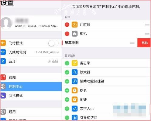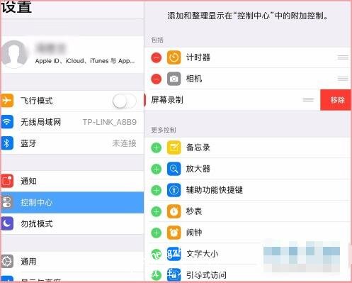2. 第二步,请大家选择刚刚看到的【控制中心】,然后我们就能在屏幕右侧看到如图所示的新界面,我们将【屏幕录制】添加到屏幕上方区域即可,此外,要是想删除控制中心的应用,我们只要在相应应用处向左滑动,并选择其中的【移除】即可。