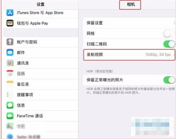 3. 第叁步,接下来,请大家按下“Home”键,这时屏幕中将会出现如图所示的录屏按钮,请大家打开iPad的【设置 - 相机】界面,我们会发现里面有分辨率的相关信息,比如720p HD,30 fps和1080p HD,30fps两种选择。