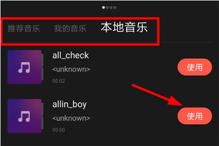 3、这时候除了官方提供的在线音乐外,我们还可以上传手机本地的音频文件作为配乐,也就是本地音乐,找到自己心仪的音乐,然后点击右侧的“使用”选项即可完成所有的添加操作了,最后进行编辑,一段好玩的短视频就可以“出锅”了。