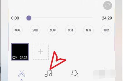 2、接下来我们就可以对添加的视频进行编辑了,通过点击底端的音乐按钮打开音乐便捷功能列表,在列表中我们选择“音乐”功能即可添加配乐了。