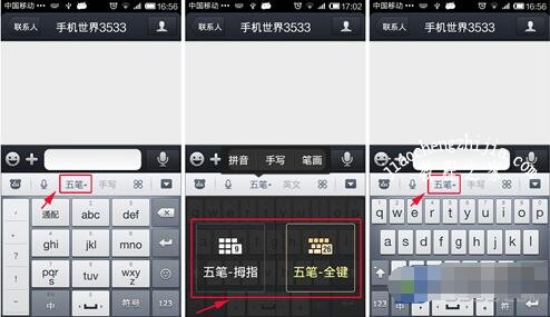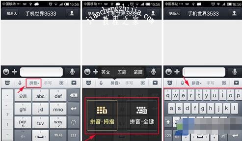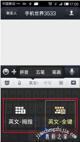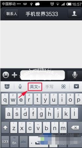 1)首先打开对话窗口,如小编以手机QQ为例,打开窗口后点击拼音,随后出现拼音,拇指(即九宫格输入)和全键盘输入,因为刚开始百度输入法默认状态是拇指键设置的,所以在下图最后一张手机世界小编展示的是全键盘输入方式;(如下图所示)