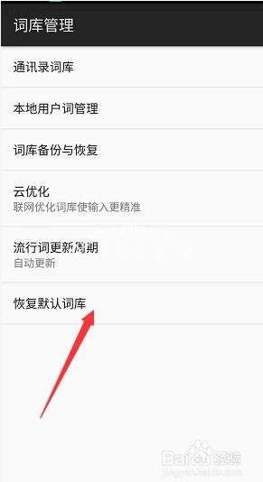 进入词库管理以后,可以看到最下面有一个恢复默认词库,点击打开即可。