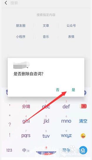 长按之后,我们看到会出现一个删除自造词的界面,我们确定的话,就点击是进行删除。