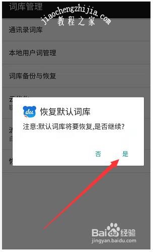 点开以后,会有一个提示的,问我们是否确定恢复,我们点击是即可,这样就回到了最初的时候词库了。