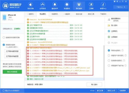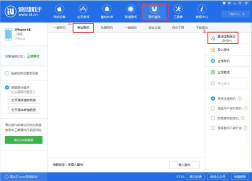 1、下载最新版爱思助手,将设备连接爱思助手后,点击上方“刷机越狱“--“专业刷机”;点击“查询SHSH”获取当前可以刷机的版本;