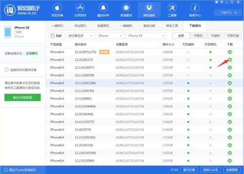2、知道自己可以刷哪些版本之后,到爱思助手“下载固件”处下载相对应的固件,下载进度及保存位置可“下载中心”查看;