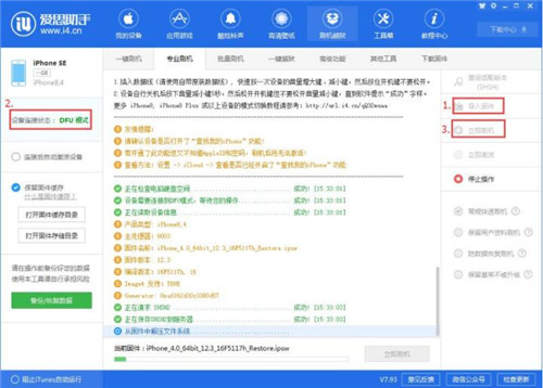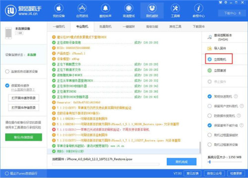 1、导入好对应固件之后,设备进入DFU模式,勾选“保留基带不被升级”(同时默认勾选“常规刷机”),点击立即刷机。