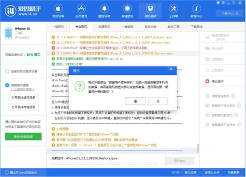 1、导入好对应固件之后,设备进入DFU模式,勾选“保留用户资料刷机”,点击立即刷机会有如下图弹窗提示,确认提示内容后再点击“是”才会开始刷机。