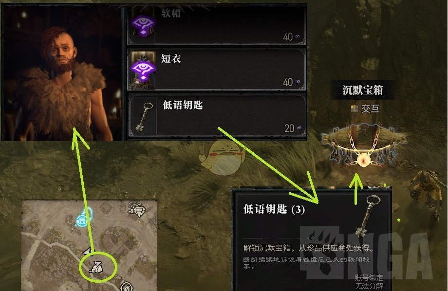 地图上会遇到一种沉默宝箱,需要用在赌博佬处用低语古币(血岩碎片,地图事件宝箱开出)买的低语钥匙开启,这个箱子的掉落相当于一个稀有怪,受地图难度影响,建议前期升级时不要开,等切换高难度地图了再开。