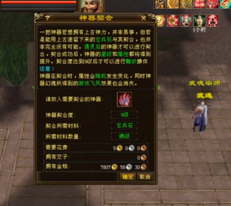 6、在神器契合的界面,神器放入,然后点确定就可以提升契合度,可以看到下图中契合度是1级别,要用到玄兵石。