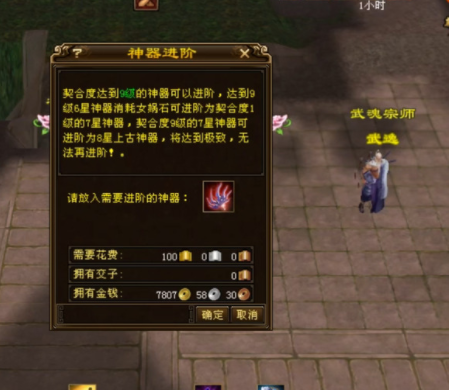 3、然后在契合度达到9级的时候,放入神器进阶的界面中点击确定,即可进阶到上古神器级别。