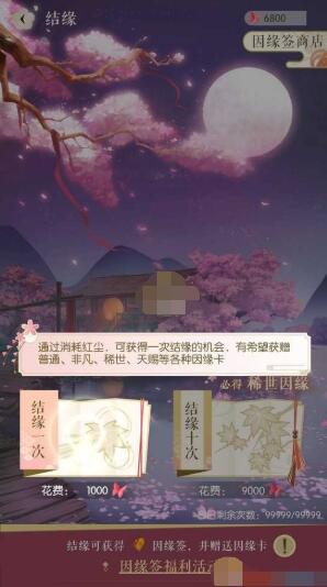 进入结缘后,每消耗1000点红尘可结缘(抽卡)1次,消耗9000点红尘可结缘10次(必定得稀有因缘卡)。